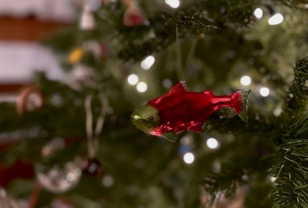 On our tree this year, we’ve added a hand-blown glass salmon ornament, red and green like Christmas.
